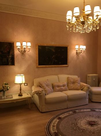 Imperini chiari su lampadario e su appliques, e paralume triangolare chiaro con angoli smussati su abat-jour.